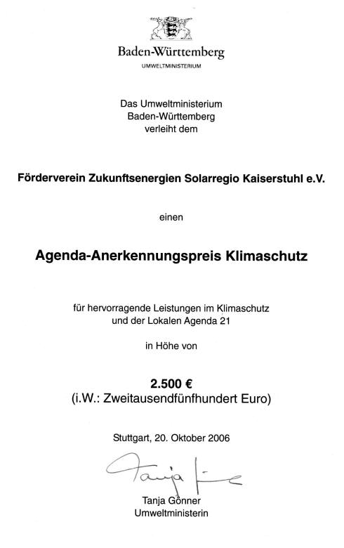 Der Förderverein "Zukunftsenergien SolarRegio Kaisterstuhl e.V." wurde 2006 mit dem Agenda-Anerkennungspreis Klimaschutz des Landes Baden-Württemberg ausgezeichnet.