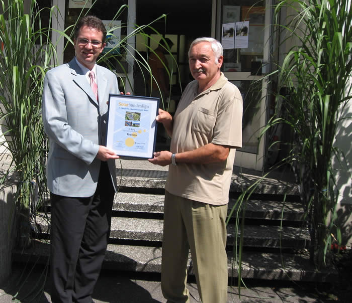 | Rudolf Höhn konnte im Namen der Projektgruppe Rheinau einen Preis für gewerbliche Betriebe an die Firma Biomark GmbH aus Freistett vergeben. Ein Preis ging auch an den Verein Reiterhof Hinterwald und die Firma Adsoba aus Holzhausen. Besonders lobenswert sei der Einsatz der Familie Fleig aus Honau, die sich trotz des fortgeschrittenen Alters und der damit verbundenen finanziellen Risiken für die Solarenergie entschlossen haben. Die Preisträger und die Gewinner des Preisausschreibens konnten für ihr Engagement Urkunden und Preise mit nach Hause nehmen. |